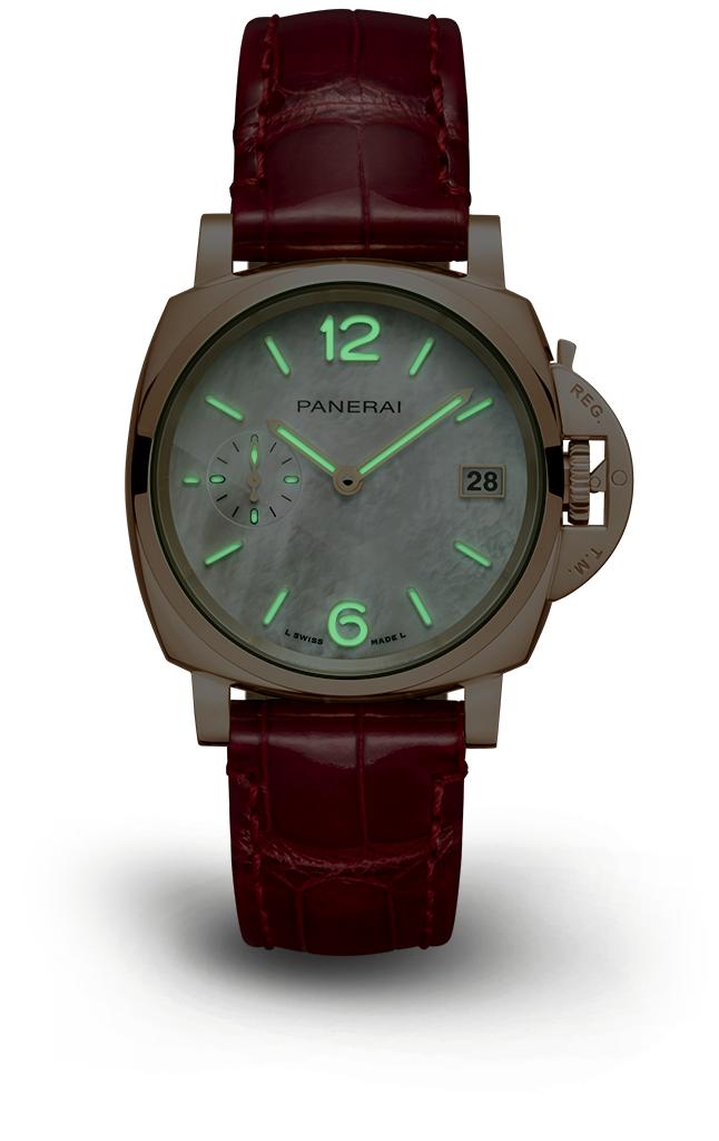 Panerai presents two distinct expressions of Valentine’s gifting. The Piccolo Due Madreperla PAM01280 offers compact elegance with a luminous mother-of-pearl dial and refined rose-gold tones, ideal for everyday sophistication.