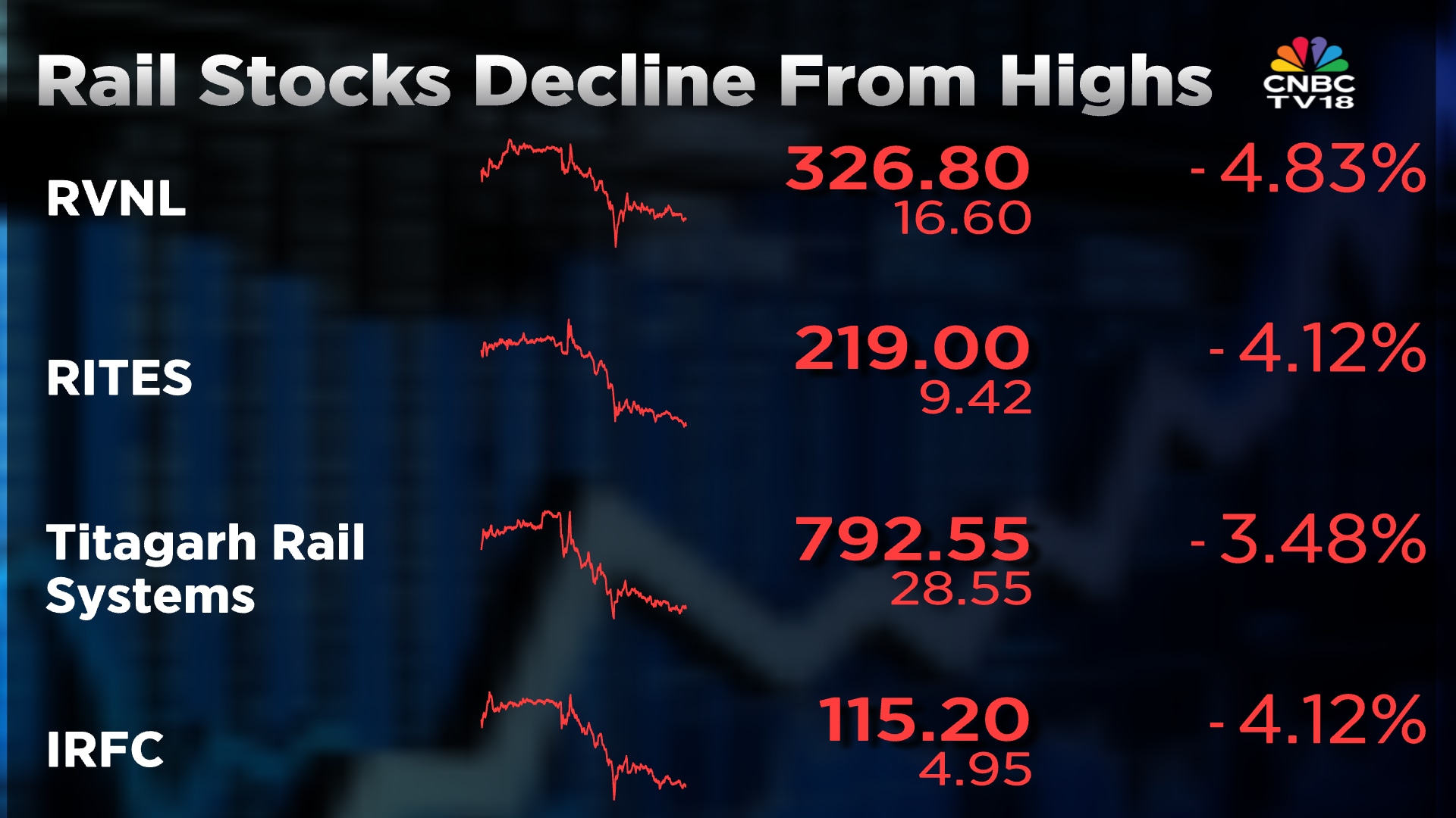Shares of IRFC are trading with losses of 4.5%, while those of RITES and RVNL are trading between 4.5% to 5.5% lower.