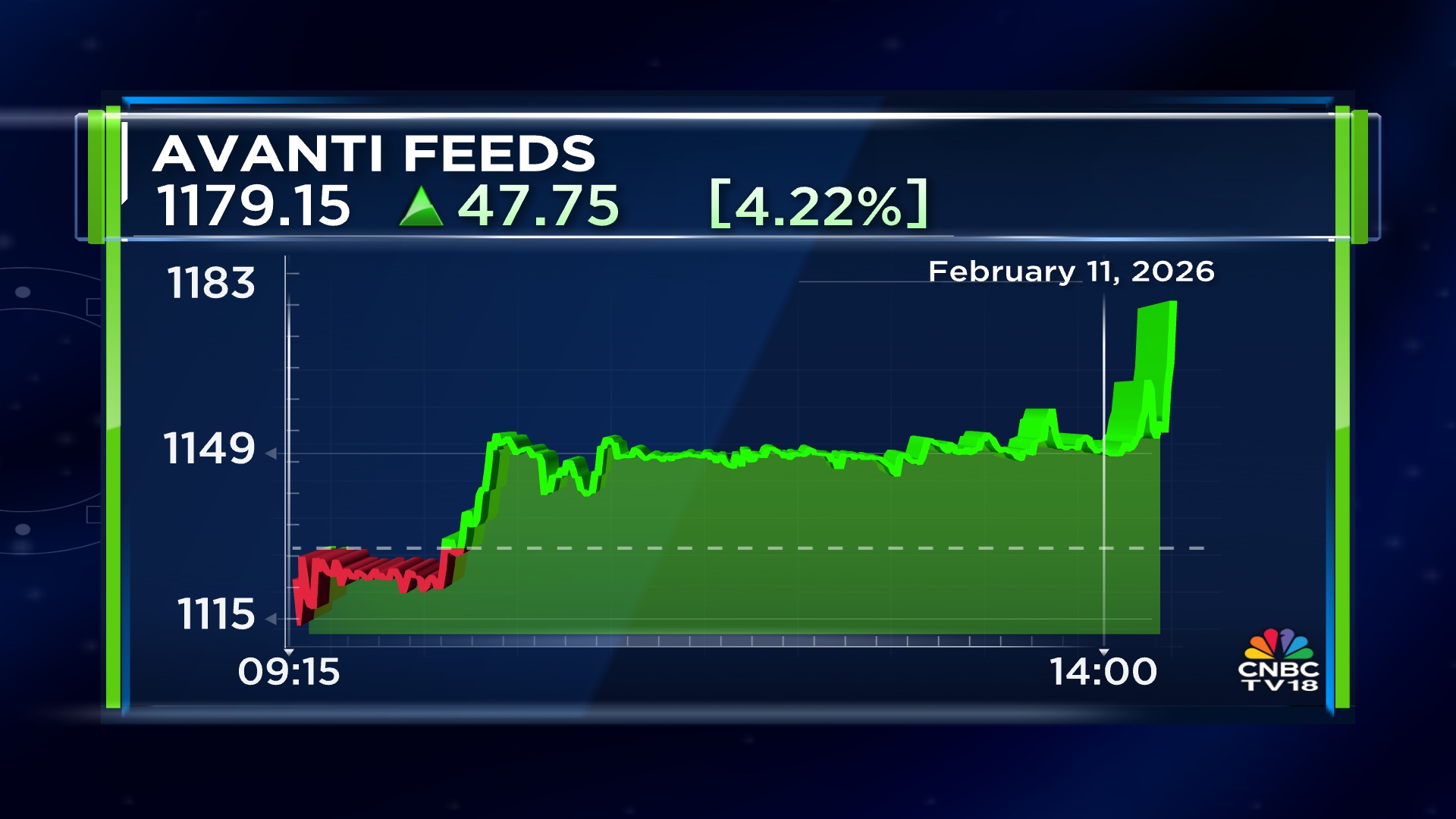 Shares of Avanti Feeds were trading 2.8% up at ₹1,163.25 apiece around 2.15 pm on Wednesday. The stock has gained 41% in the past month and 82.2% in the last six months.