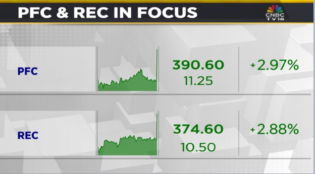 Shares of PFC are trading 3.7% higher at ₹395.7, while those of REC are trading 3% higher at ₹375.
