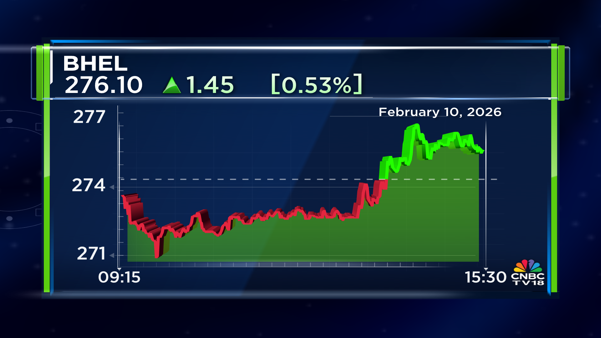 Shares of Bharat Heavy Electricals Ltd ended at ₹276.05, up by ₹1.45, or 0.53%, on the BSE.