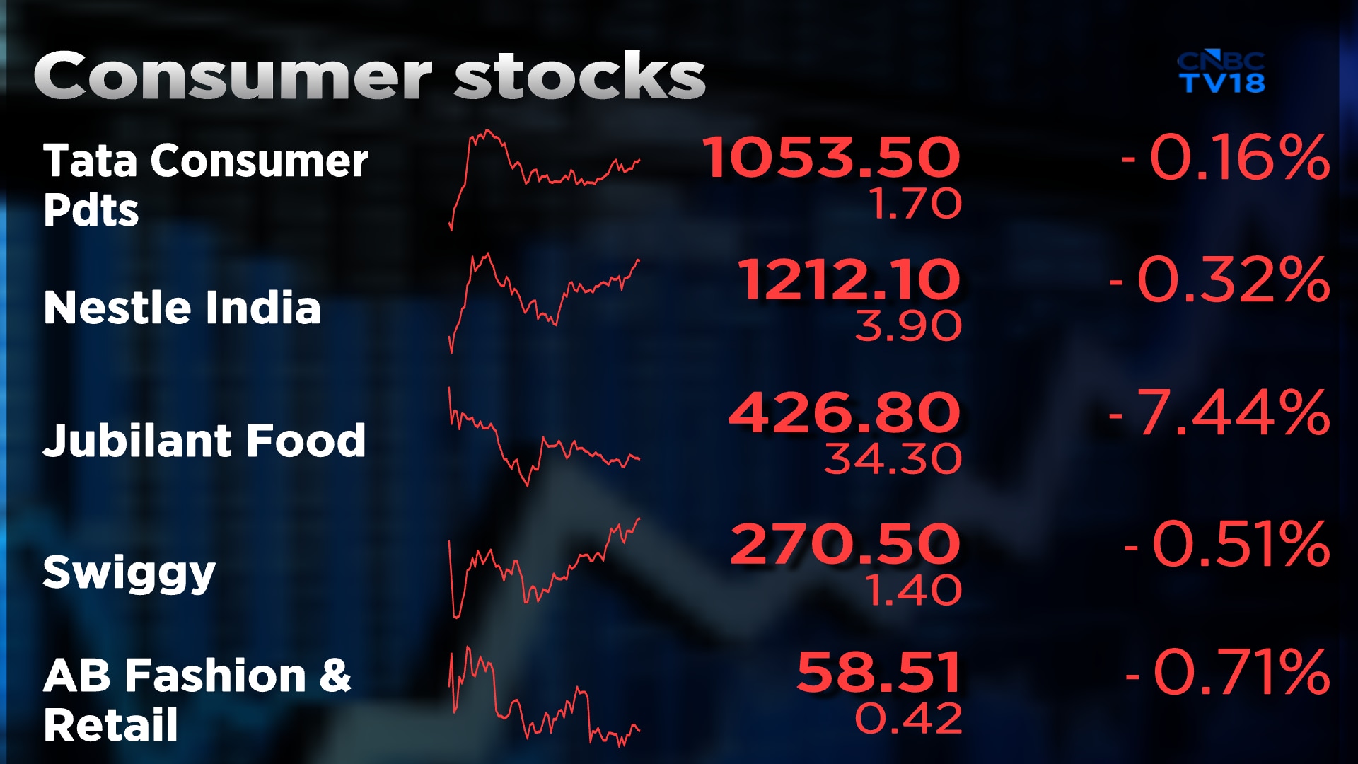 Shares of Tata Consumer are trading 0.6% lower at ₹1,048.3. Shares of Aditya Birla Fashion are trading little changed at ₹58.84.