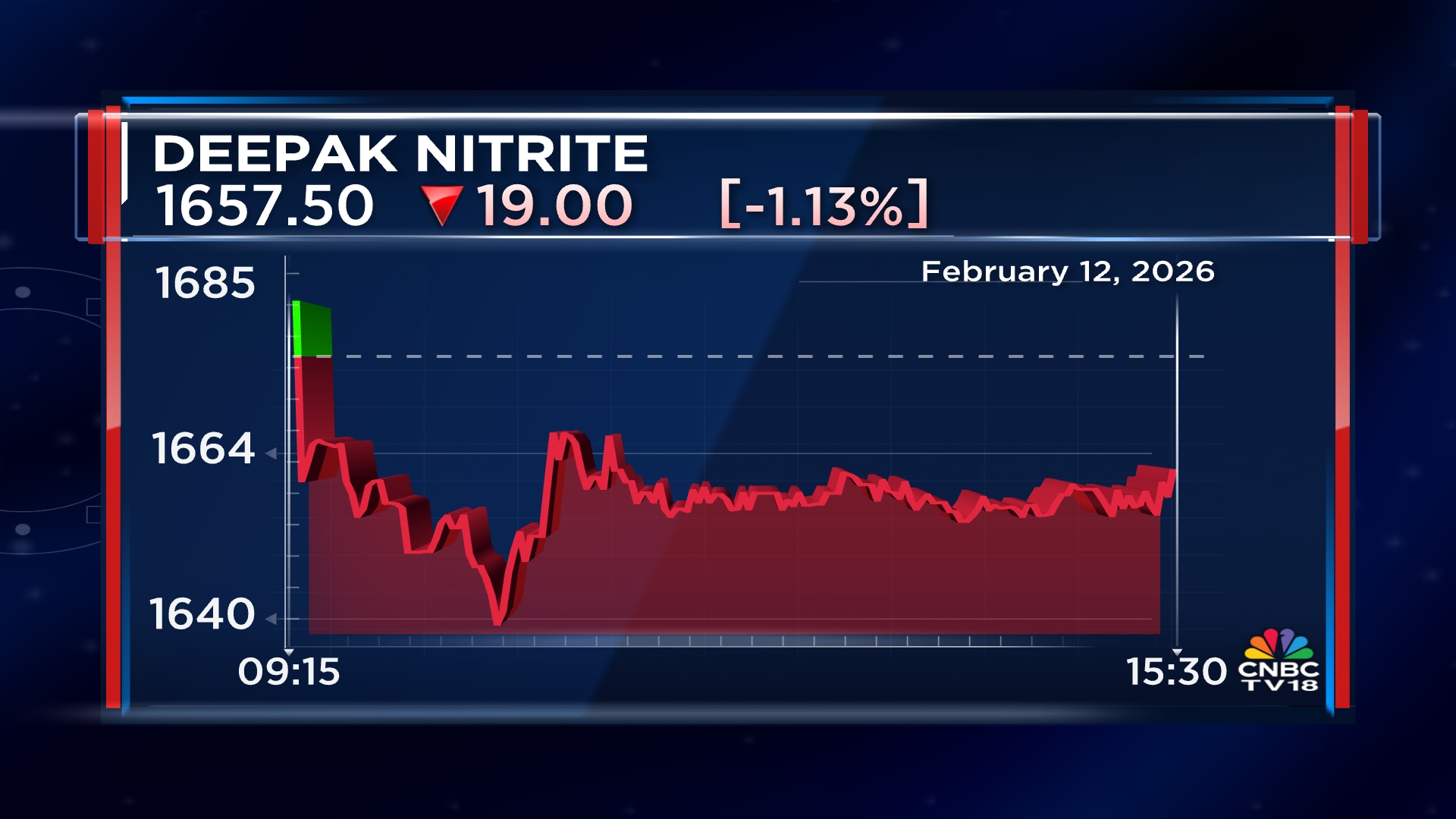Shares of Deepak Nitrite Ltd ended at ₹1,657.50, down by ₹19.00, or 1.13%, on the BSE.