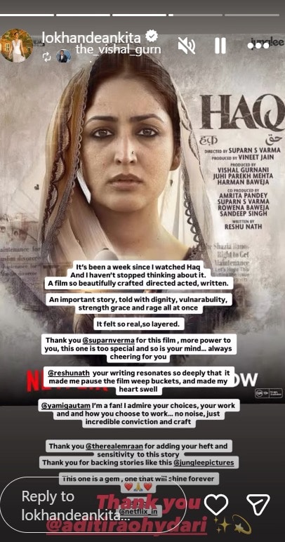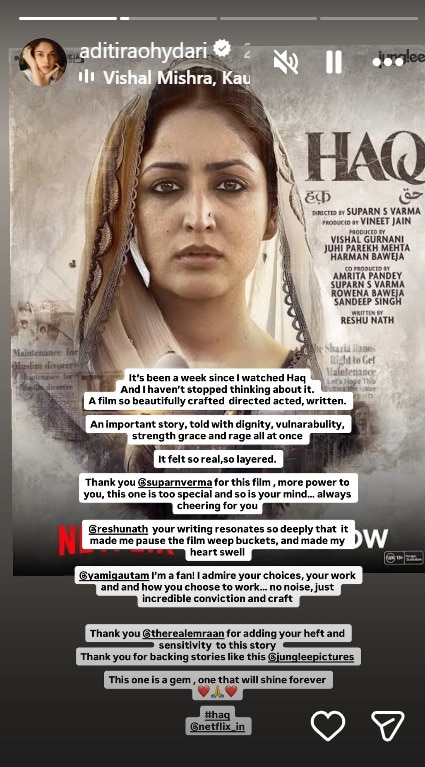 Taking to her Instagram stories, Aditi Rao Hydari wrote, “It’s been a week since I watched Haq And I haven’t stopped thinking about it. A film so beautifully crafted, directed, acted, written. An important story, told with dignity, vulnerability, strength, grace and rage all at once. It felt so real, so layered.
