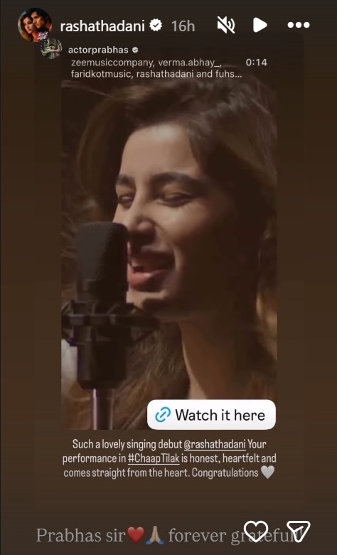 Taking to his Instagram stories, Prabhas shared the video and wrote, “Such a lovely singing debut. @rashathadani Your performance in #ChaapTilak is honest, heartfelt and comes straight from the heart. Congratulations” Rasha also reacted saying ‘Prabhas sir forever grateful’.