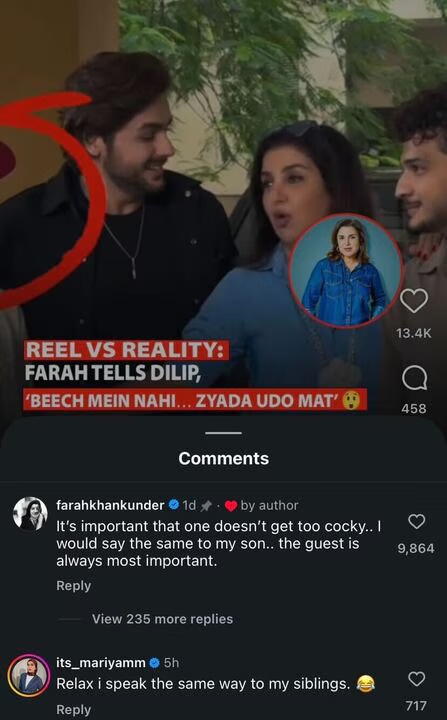 This reel of Farah was shared by a social media page, and the text on the reel reads, “Reel vs Reality, Farah tells Dilip ‘Beechmein nahi… zyada udo mat.’” This post caught Farah’s attention, who didn’t let it pass and decided to hit back at the admin. In the comment section, the filmmaker replied, “It’s important that one doesn’t get too cocky. I would say the same to my son. The guest is always the most important.”