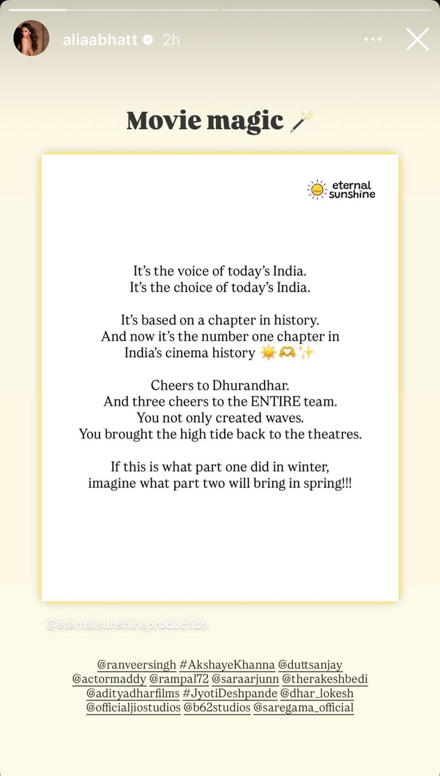 cinema history. Cheers to Dhurandhar. And three cheers to the ENTIRE team. You not only created waves —you brought the high tide back to the theatres. If this is what part one did in winter, imagine what part two will bring in spring!!!” She reposted it with the caption, “Movie magic.”