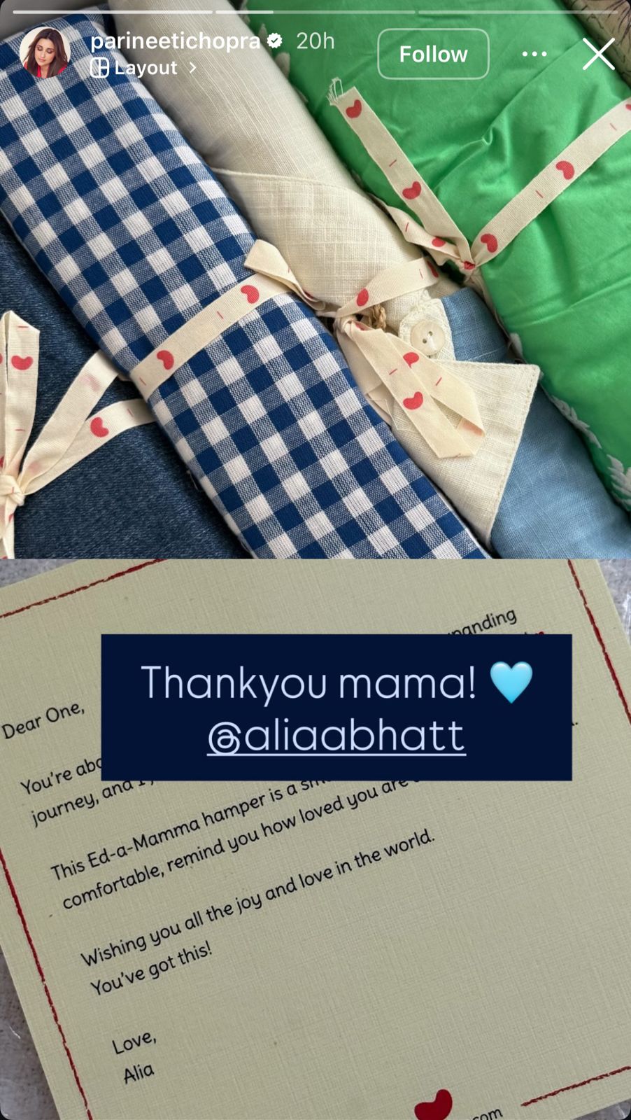 Parineeti shared on her Instagram Story that Alia had sent her a hamper from her brand, Ed-A-Mamma. Alia’s brand focuses on children’s care and needs. Parineeti Chopra wrote, “Thank you, mama!” Have a look at the post here: