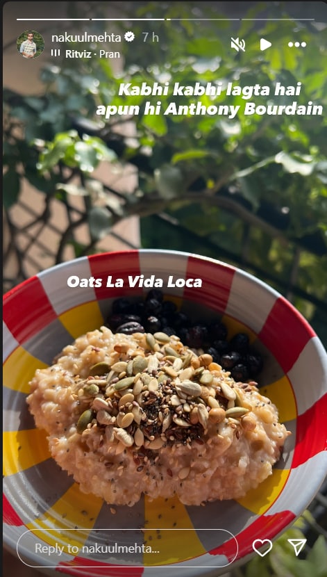 Taking to his Instagram stories, the Ishqbaaaz actor shared a visually appealing photo of his breakfast. The dish wasn’t just plain oats, it was topped with chia seeds and also included fresh berries on side. While humorously calling it “Oats La Vida Loca,” the actor added, “Kabhi kabhi lagta hai apun hi Anthony Bourdain.”