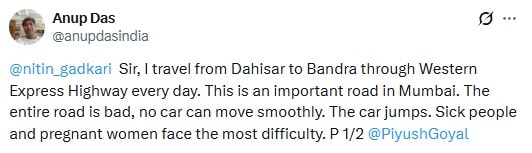 Commuters also expressed concern over road conditions, with one user tweeting, “@nitin_gadkari Sir, I travel from Dahisar to Bandra through Western Express Highway every day. This is an important road in Mumbai. The entire road is bad, no car can move smoothly. The car jumps. Sick people and pregnant women face the most difficulty. P 1/2 @PiyushGoyal. (sic)”