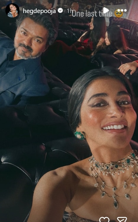 Taking to her Instagram stories, Pooja Hegde shared a selfie with Thalapathy Vijay and wrote, “One last time” with sad face emoji. With its Pongal 2026 release drawing closer, Jana Nayagan, headlined by Thalapathy Vijay, continues to build momentum.