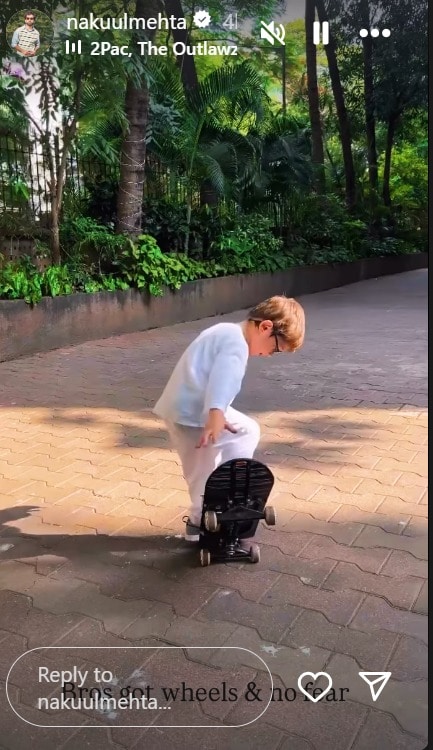 Actor Nakuul Mehta recently took his phone to put up a lovely video on Instagram story of his son Sufi learning to skateboard. Sufi was seen trying to skate, falling once, but he got up immediately