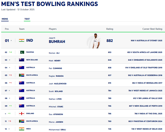 show by Noman in Pakistan’s 93-run win over the 2025 World Test Championship (WTC) winners at Gaddafi Stadium helped him jump four places on Wednesday (October 22) and become the new world No. 2 Test bowler.