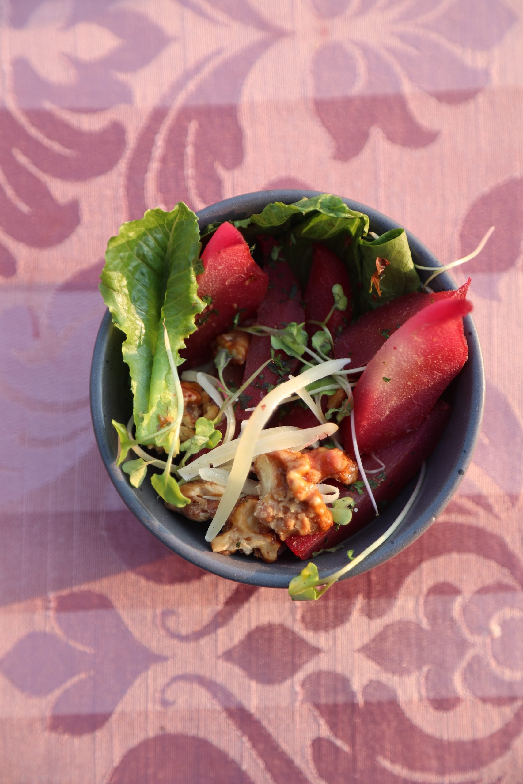 Poached Pears with Candied Walnuts, Romaine & Cheese Salad