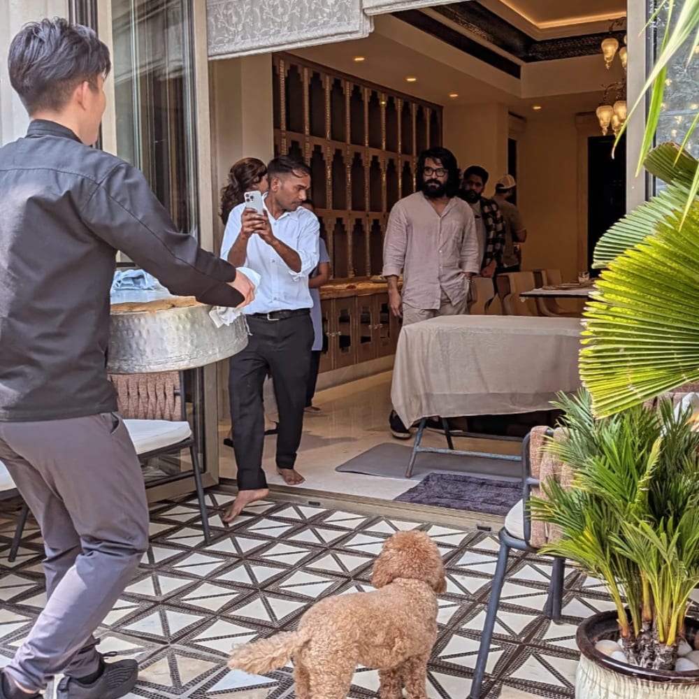 Osawa’s visit unfolded like an experience rather than a meal. He documented the tranquil surroundings of the Charan household — koi fish, exotic birds, and their pet dog Rhyme offering a calm welcome. After preparing ingredients indoors, the chef moved outdoors to cook the biryani in a traditional style, letting technique and aroma take centre stage.