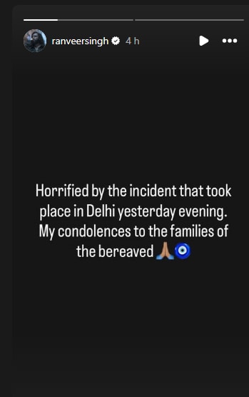 On social media, Ranveer shared his distress, writing on Instagram Stories, “Horrified by the incident that took place in Delhi yesterday evening. My condolences to the families of the bereaved.”