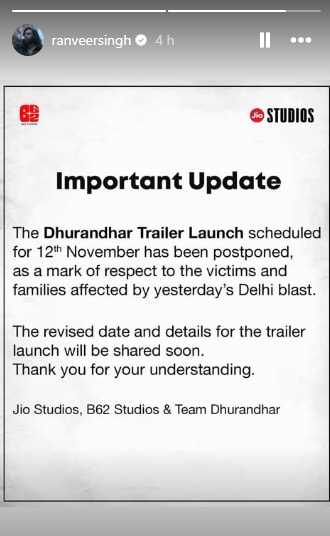 Ranveer Singh also reposted a statement from the team of his upcoming film Dhurandhar, confirming that the trailer launch, originally scheduled for November 12 in Mumbai, had been postponed as a mark of respect. The statement read: “The Dhurandhar trailer launch scheduled for 12th November has been postponed, as a mark of respect to the victims and families affected by yesterday’s Delhi blast. The revised date and details for the trailer launch will be shared soon. Thank you for your understanding. — Jio Studios, B62 Studios & Team Dhurandhar.”