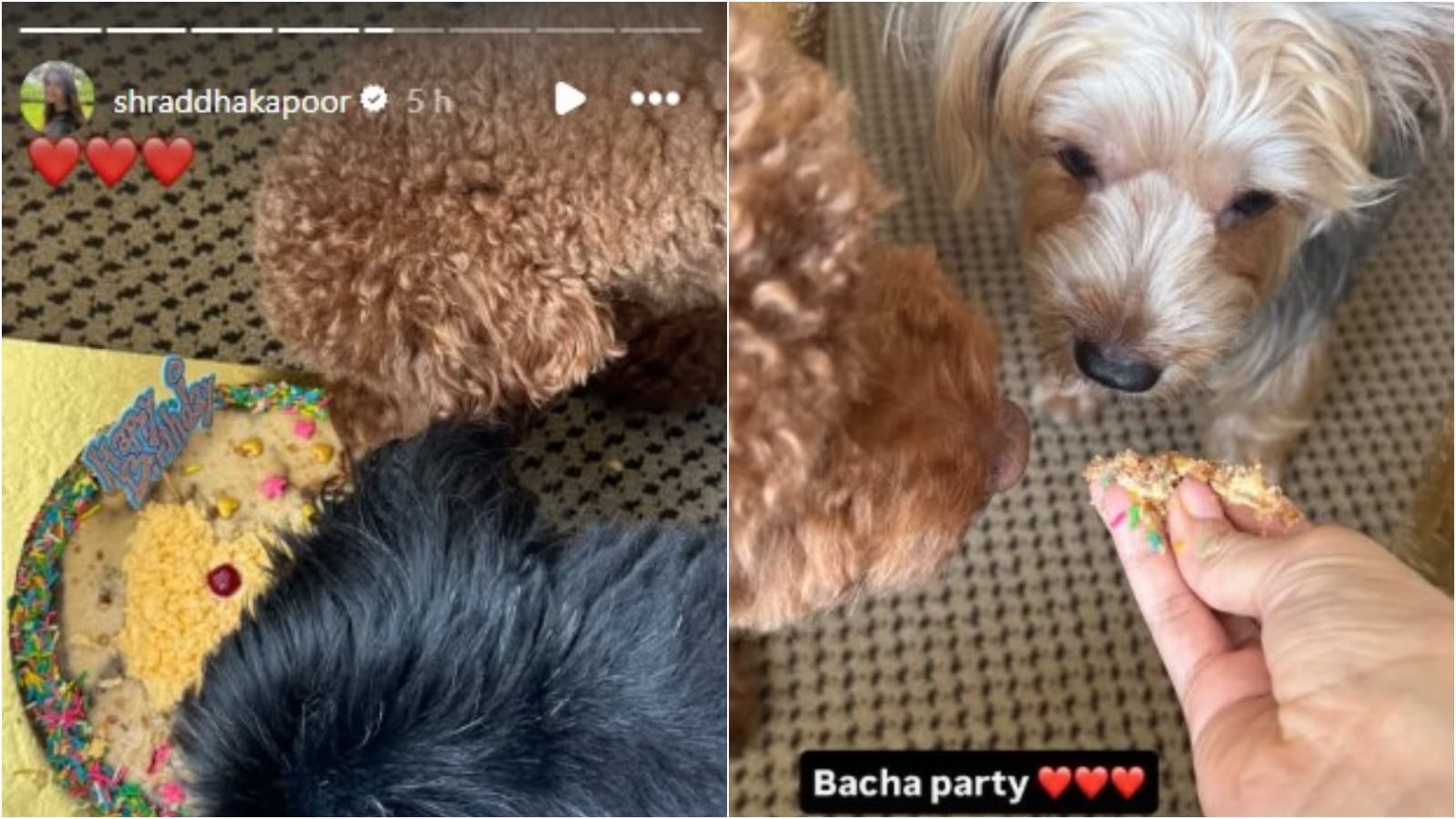from the series of clicks, captures Shraddha feeding small bites of the treat to the pets, with the caption “Bacha party,” indicating that it was a mini celebration for all her furry companions.