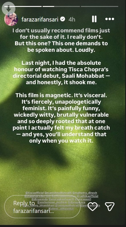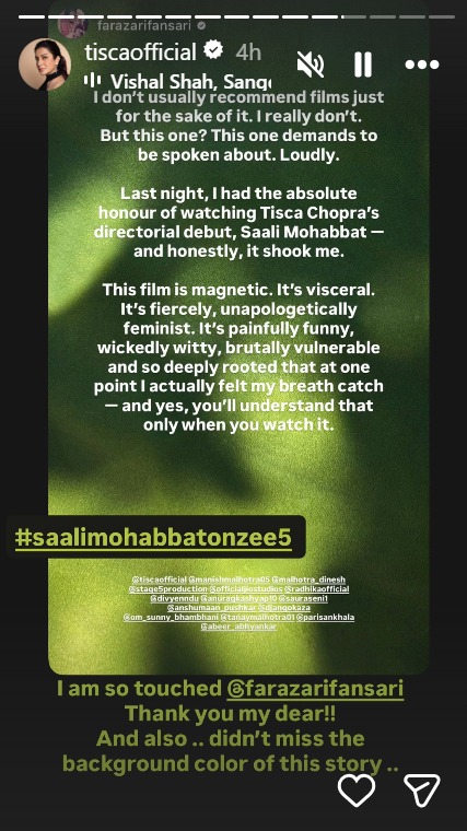 Ahead of its premiere, the makers of Saali Mohabbat hosted a grand screening in Mumbai. After watching the movie, Faraz Arif Ansari opened up about Tisca Chopra’s first full-length directorial work and showered it with praise in a series of Instagram stories.