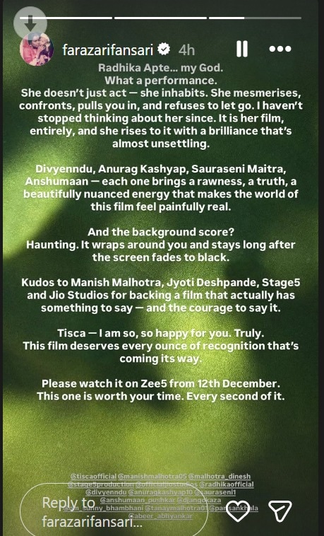 In the following post, the filmmaker discussed the work of each team member. Lauding Radhika Apte, he said, “My God. What a performance. She doesn’t just act – she inhabits. She mesmerises, confronts, pulls you in, and refuses to let go. I haven’t stopped thinking about her since. It is her film, entirely, and she rises to it with brilliance that’s almost unsettling.”