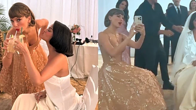 The clip showed Taylor behind the camera, filming Selena as she prepared for her wedding to music producer Benny Blanco in Santa Barbara. Beaming with pride and emotion, Taylor can be heard saying, “Are you even serious right now? Just look at her!” as she zoomed in on Selena’s glowing bridal glam. The bride stunned in a timeless ivory gown with delicate lace details and soft makeup, while Taylor herself looked radiant in a floral-embellished champagne dress and signature red lip.