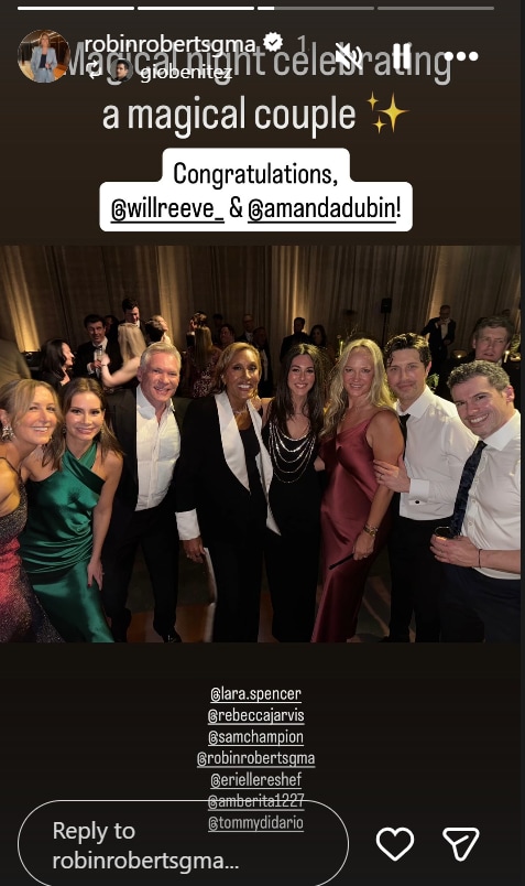 On Sunday, several of Reeve’s ABC News colleagues shared glimpses from Miami. Robin Roberts posted a group photo with her wife Amber Laign, alongside Sam Champion, Lara Spencer and others, gathered around a table with drinks. The post referenced a pre-wedding celebration before the ceremony.
