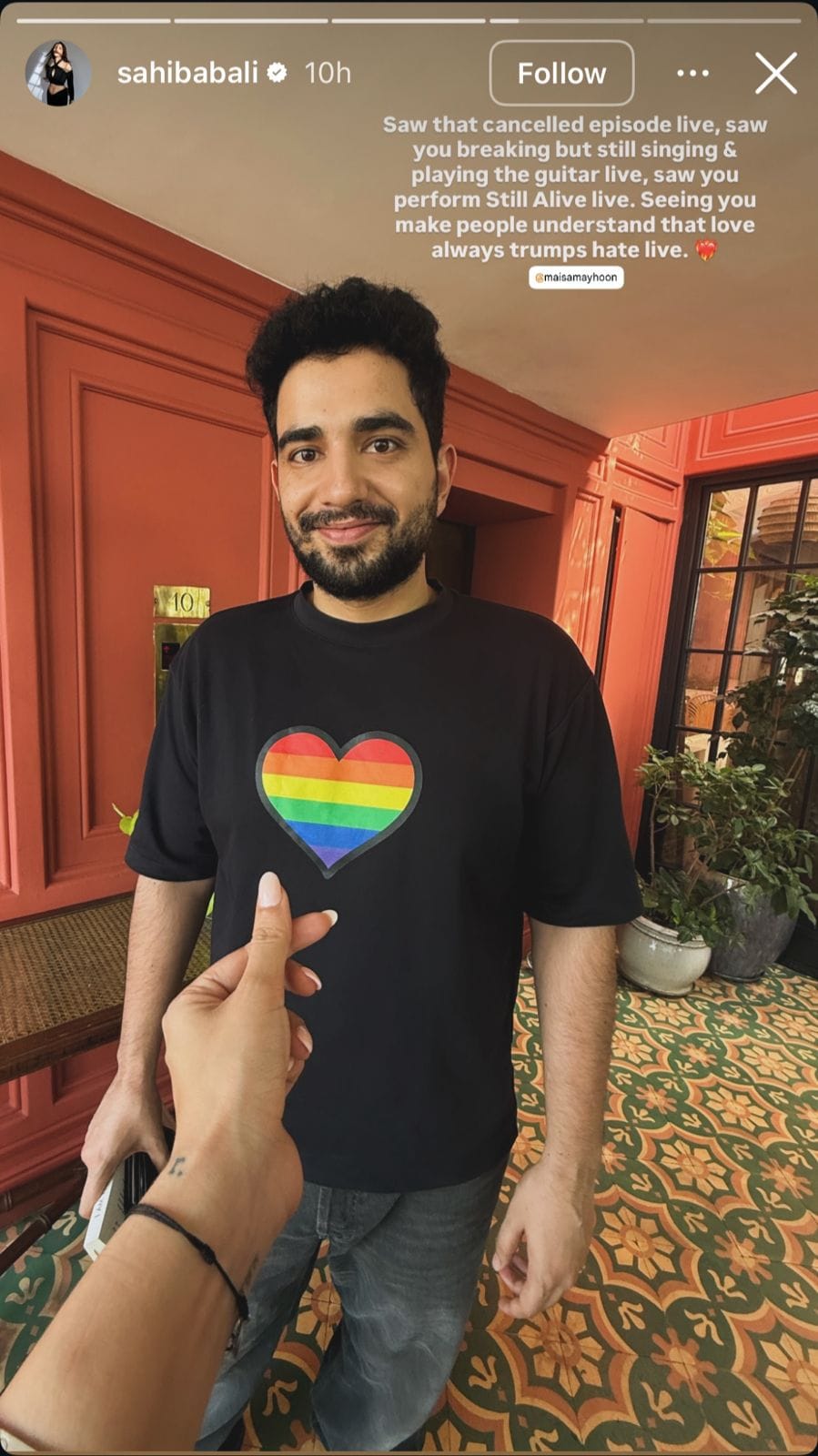 Sahiba Bali wrote, “Saw that cancelled episode live, saw you breaking but still singing and playing the guitar live, saw you perform Still Alive live. Seeing you make people understand that love always triumphs hate live.” She also shared a photo of the comedian in which she made the Korean heart symbol.