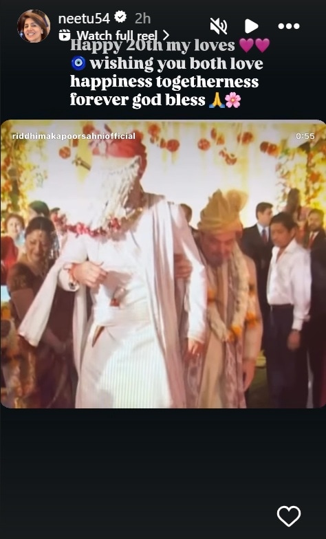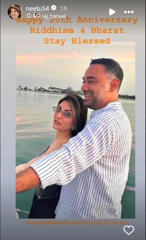 Resharing Riddhima’s anniversary post for Bharat on the Stories section of her Instagram handle, Neetu wrote, “Happy 20th my loves (pink hearts and evil eye emojis) Wishing you both love happiness togetherness forever god bless (Folded hands and flower