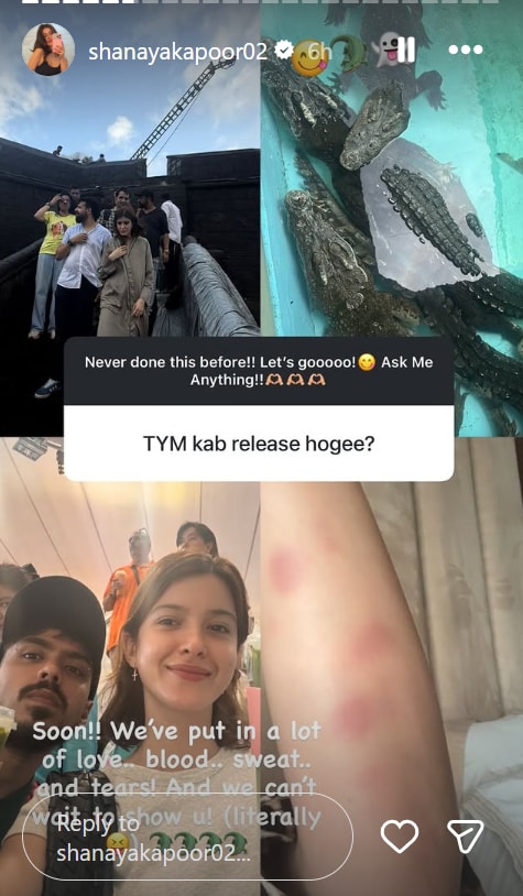 In response, Shanaya shared several snippets from the film on her Instagram Stories. These included pictures of her bonding with the team, posing with crocodiles, glimpses of injuries she sustained while shooting, and a selfie with her co-star Adarsh Gourav. After sharing the photos, the actress wrote, “Soon! We’ve put in a lot of love… blood… sweat… and tears! And we can’t wait to show you! (literally)” She also added a few crocodile emojis, hinting at the film’s thrilling elements.