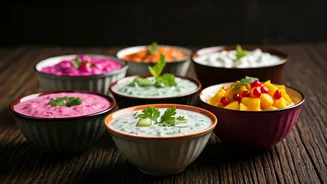 creamy contrast to spicy Indian food. Raita's cooling properties come from the yogurt base, which is beneficial for digestion, particularly after eating spicy food. Beyond the flavor and digestive benefits, raita is simple to prepare, requiring minimal cooking and is easily customized with vegetables, fruits, herbs, and spices. From basic cucumber to elaborate fruit varieties, the potential for creativity in raita recipes is endless, making it a versatile addition to any meal.