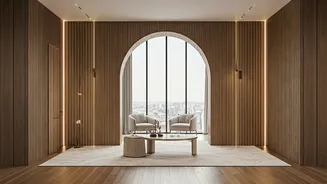 • The 6,500 sq ft apartment features an arched hallway with oak flooring.