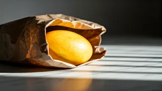 When your mangoes have begun their transformation, showing hints of yellow but not yet reaching peak ripeness, paper bags can be used to extend their perfect state and prevent them from becoming overly soft too quickly. In this scenario, place the almost-ripe mangoes into a loosely folded paper bag. The key here is to then move this bag to a cooler location within your kitchen. This strategic placement, combined with the bag's breathability, helps to control the humidity surrounding the fruit. By allowing air to circulate, it prevents excessive moisture from condensing on the mangoes, which is a primary cause of softening and potential spoilage. This controlled environment helps to slow down the ripening process just enough, ensuring you have a window of opportunity to enjoy them at their ideal stage.