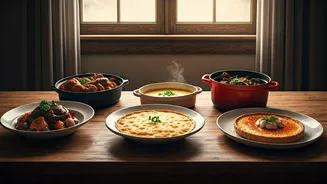 Boeuf Bourguignon is the quintessential French beef stew, a hearty and deeply satisfying dish perfect for a comforting meal. It features succulent chunks of beef slow-cooked to melting tenderness in a robust red wine sauce, typically Burgundy, alongside classic aromatics like carrots and onions, and a bouquet of herbs. The extended simmering process allows the beef to absorb the rich flavors of the wine and vegetables, resulting in an incredibly tender and deeply savory experience. This dish is often paired with creamy mashed potatoes or crusty bread to soak up the delectable sauce, making it a complete and filling feast. It truly embodies the spirit of traditional French home cooking, where time, patience, and simple, quality ingredients culminate in a profoundly comforting and flavorful dish.