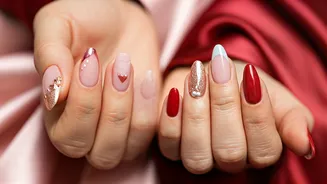 For those who appreciate subtle yet impactful design, the monochrome hearts manicure is an ideal choice. Featuring thin merlot slices and delicate heart motifs, this design looks stunning on both short and long nails. It’s a sophisticated option for minimalists who still want to participate in the Valentine's Day festivities. The deep, rich hue of merlot adds a touch of understated luxury, while the dainty heart details provide a sweet nod to the holiday. This manicure strikes a perfect balance between modern minimalism and festive charm, making it a versatile and elegant selection.