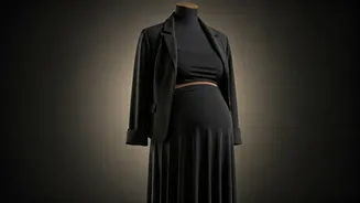 crop top, complemented by a long-sleeve blazer. The blazer's double collar and notch lapels added a touch of sophistication. A pencil-fit maxi skirt replaced traditional suit trousers, crafting a maternity-friendly silhouette that maintained a tailored appearance. The strategic selection of these pieces showcased the ability to merge practicality with high fashion, presenting a stylish look that spoke volumes. This carefully constructed choice displayed an understanding of how to balance comfort with contemporary fashion, specifically for maternity wear.