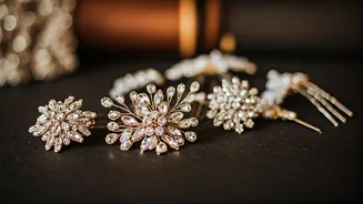 For those desiring a touch of glamour, 'Loose curls with blingy stones' offers an enchanting option. The natural flow of loose curls provides a romantic and soft aesthetic, while the strategically placed blingy stones add a dazzling element. The stones can be arranged in a pattern or scattered across the curls to achieve the desired effect, enhancing the overall appeal. This hairstyle is perfect for brides looking to make a statement and embrace a glamorous feel. The texture of the curls creates beautiful movement, and the stones reflect light, ensuring you sparkle as you move around. This style works well with both long and medium hair lengths, offering versatility for different hair types and preferences. Choose stones that complement the colors in your outfit to create a harmonious and captivating look.