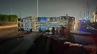 Petrol leaked onto the road, filling the potholes, prompting police to rush to the scene. The leakage was controlled using cloth and plastic sheets, and traffic was halted as a precaution. Senior officers and the fire brigade reached the spot, and the tanker was removed with the help of a crane before traffic resumed.