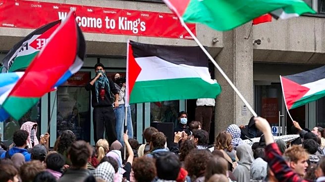 In London, several hundred protesters waved Palestinian flags and shouted, "Israel is a terrorist state" outside King's College London. A small group of people waving Israeli flags stood nearby.