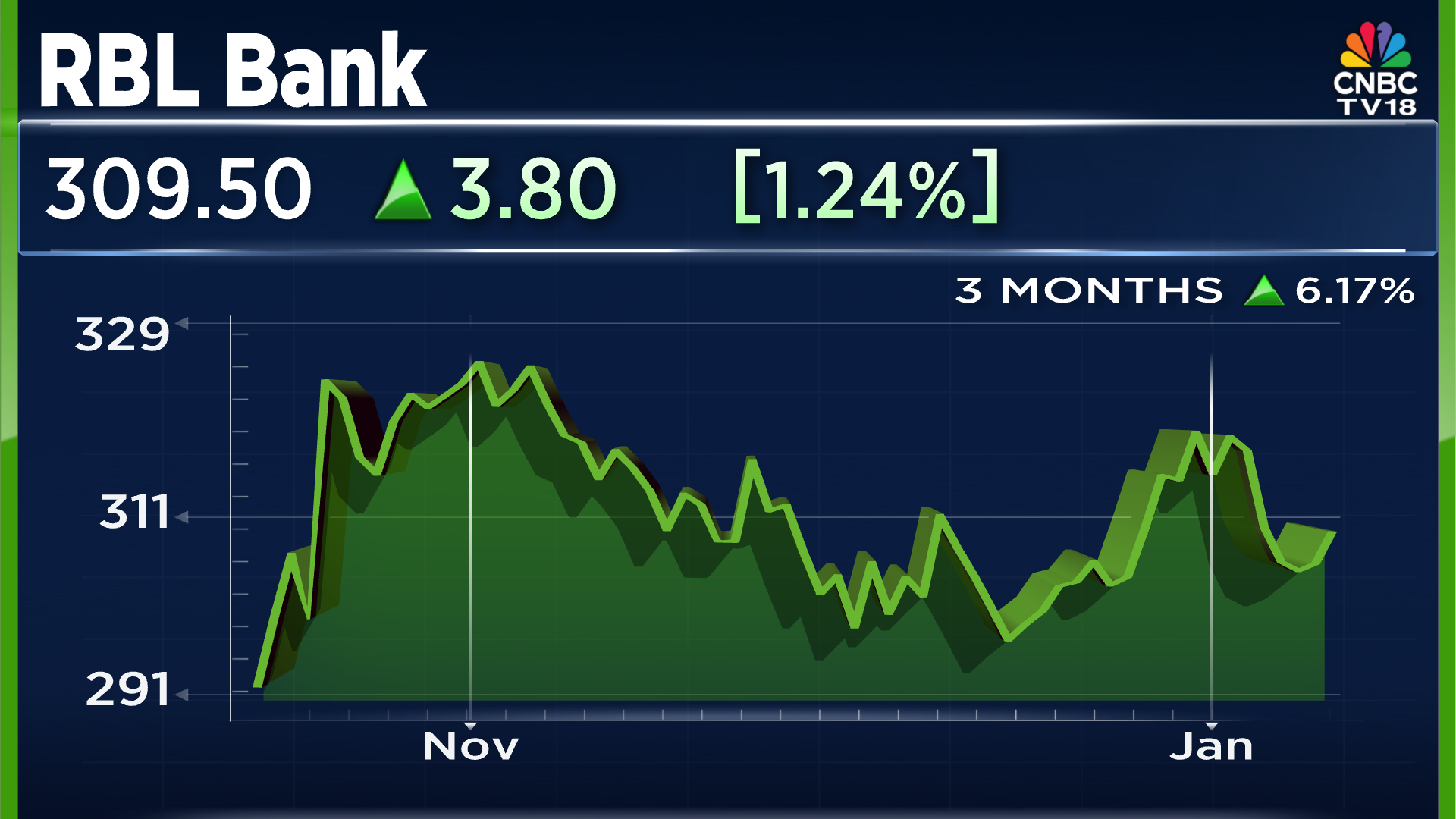Shares of RBL Bank are trading 1.3% higher at ₹309.65. The stock is trading close to its 52-week high of ₹332, having doubled in value over the last 12 months with gains of 101%.