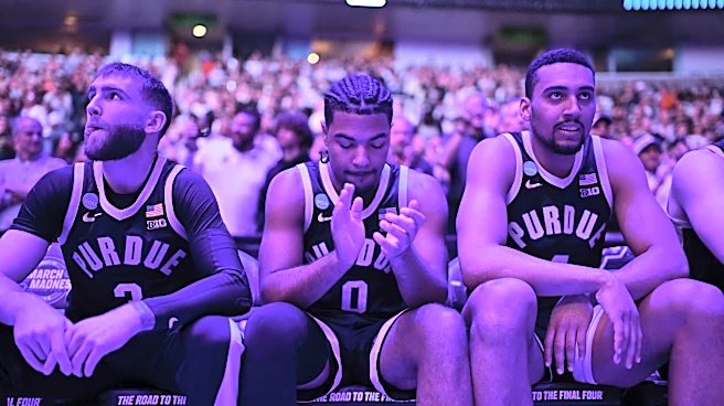 SAN JOSE, CALIFORNIA - MARCH 28: Braden Smith #3, C.J. Cox #0, and Trey Kaufman-Renn #4 of the Purdue Boilermakers wait on the bench against the Arizona Wildcats during the Elite Eight round game of the 2026 NCAA Men's Basketball Tournament held at SAP Center on March 28, 2026 in San Jose, Californi
