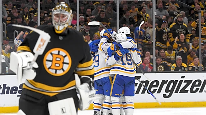 BOSTON, MASSACHUSETTS - APRIL 24: The Buffalo Sabres celebrate the third-period goal against the Boston Bruins in Game Three of the First Round of the 2026 Stanley Cup Playoffs at the TD Garden on April 24, 2026 in Boston, Massachusetts. (Photo by Steve Babineau/NHLI via Getty Images) *** Local Capt