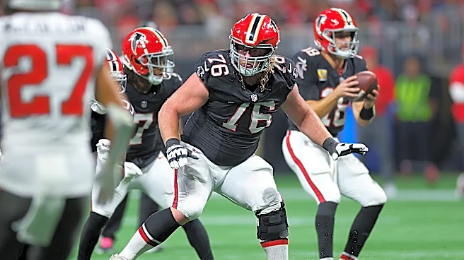 ATLANTA, GEORGIA - OCTOBER 03: Kaleb McGary #76 of the Atlanta Falcons blocks againstthe Tampa Bay Buccaneers during the third quarter at Mercedes-Benz Stadium on October 03, 2024 in Atlanta, Georgia. (Photo by Kevin C. Cox/Getty Images) | Getty Images Longtime Atlanta Falcons right tackle Kaleb McG