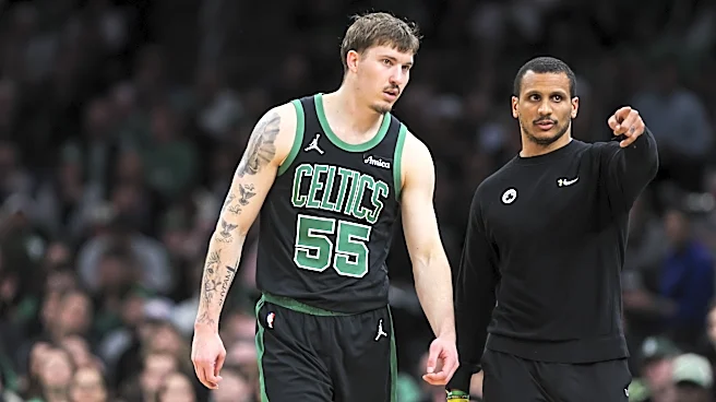 BOSTON, MA - MARCH 18: Head Coach Joe Mazzulla of the Boston Celtics talks to Baylor Scheierman #55 of the Boston Celtics during a game against the Brooklyn Nets at TD Garden on March 18, 2025 in Boston, Massachusetts. NOTE TO USER: User expressly acknowledges and agrees that, by downloading and or