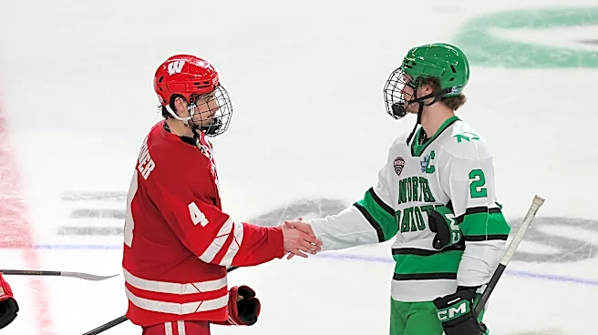 LAS VEGAS, NEVADA - APRIL 09: Ben Dexheimer #4 of the Wisconsin Badgers and Bennett Zmolek #2 of the North Dakota Fighting Hawks shake hands after a game during the NCAA Division I Men's Ice Hockey Frozen Four semifinal at the T-Mobile Arena on April 9, 2026 in Las Vegas, Nevada. The Badgers won 2-1
