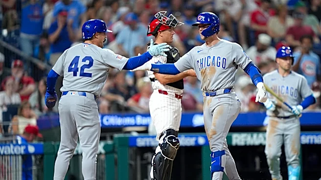 Apr 15, 2026; Philadelphia, Pennsylvania, USA; Chicago Cubs infielder Nico Hoerner (42) reacts with infielder Matt Shaw (42) hits a two-run home run against the Philadelphia Phillies in the fifth inning at Citizens Bank Park. Mandatory Credit: Kyle Ross-Imagn Images | Kyle Ross-Imagn Images For the