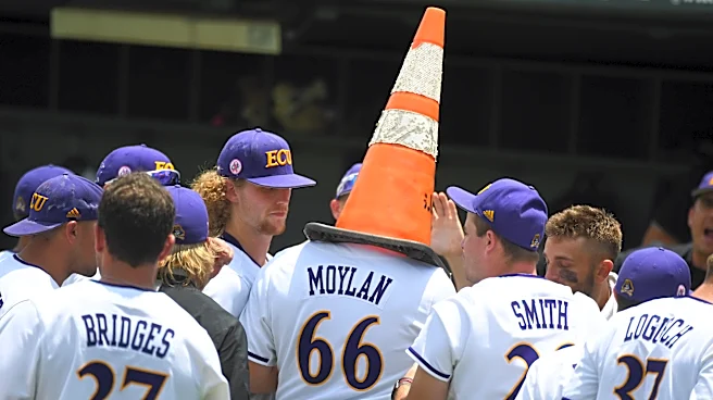 Jun 12, 2021; Nashville, TN, USA; East Carolina Pirates infielder Josh Moylan (66) has a traffic cone put on his head as he celebrates after a home run during the seventh inning against the Vanderbilt Commodores in the Nashville Super Regional of the NCAA Baseball Tournament at Hawkins Field. Mandat