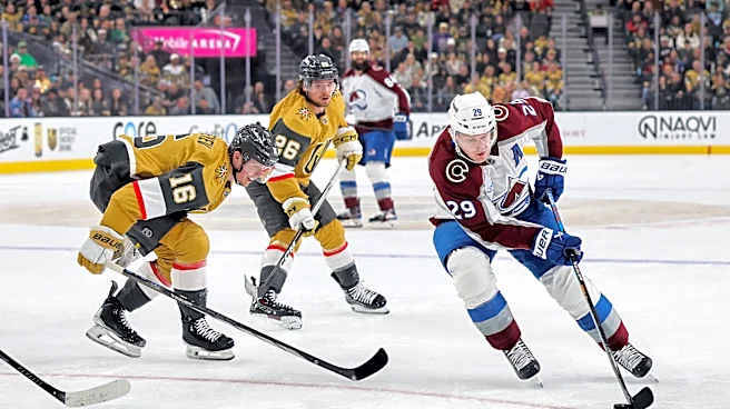 LAS VEGAS, NEVADA - DECEMBER 27: Nathan MacKinnon #29 of the Colorado Avalanche skates with the puck against Pavel Dorofeyev #16 of the Vegas Golden Knights as Alexander Holtz #26 of the Golden Knights looks on in the first period of their game at T-Mobile Arena on December 27, 2025 in Las Vegas, Ne