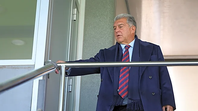 Barcelona's newly re-elected president Joan Laporta arrives to watches a training session on the eve of their UEFA Champions League last 16 second leg football match against Newcastle United at the Joan Gamper training ground in Sant Joan Despi, near Barcelona, on March 17, 2026. (Photo by Josep LAG