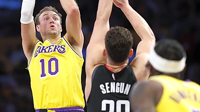 LOS ANGELES, CALIFORNIA - APRIL 18: Luke Kennard #10 of the Los Angeles Lakers shoots over the defense of Alperen Sengun #28 of the Houston Rockets during the first half of Game One of the First Round of the NBA Western Conference Playoffs at Crypto.com Arena on April 18, 2026 in Los Angeles, Califo