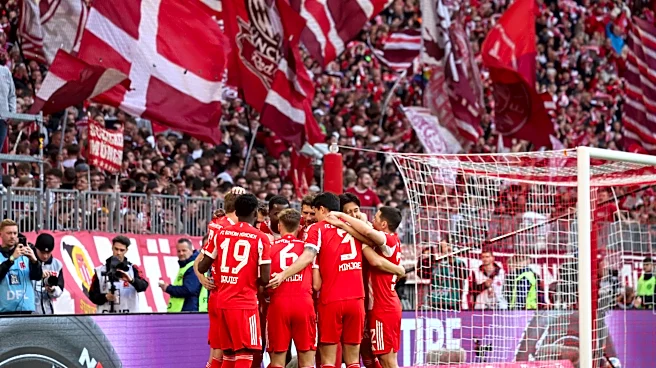 Bayern Munich's English forward #09 Harry Kane (L) celebrates with team mates after scoring the 4-1 goal as fans cheer in the background during the German first division Bundesliga football match between FC Bayern Munich and VfB Stuttgart in Munich, southern Germany, on April 19, 2026. (Photo by Kar
